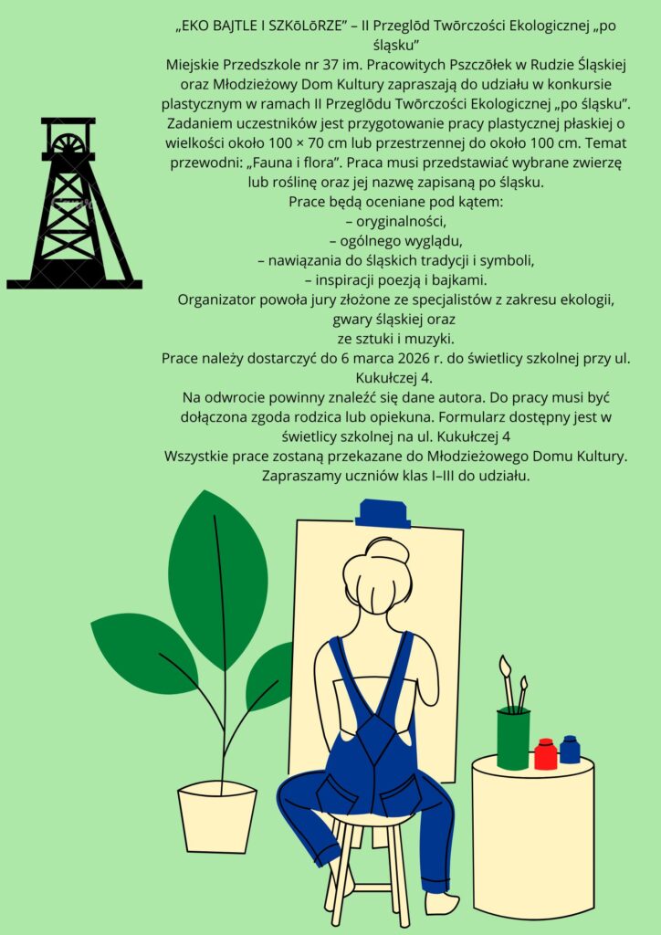 Serdecznie zapraszamy uczniów klas I–III do udziału w II Przeglądzie Twórczości Ekologicznej „po śląsku”. Organizatorami konkursu są Miejskie Przedszkole nr 37 im. Pracowitych Pszczółek w Rudzie Śląskiej oraz Młodzieżowy Dom Kultury.