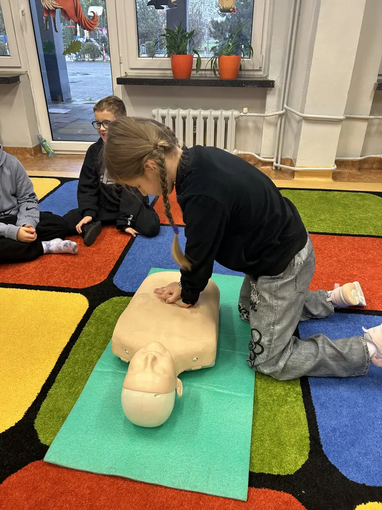 Kolejnym etapem zajęć było przypomnienie kluczowych zasad udzielania pierwszej pomocy. Uczniowie sprawdzili zawartość szkolnych apteczek, obejrzeli film edukacyjny, a nawet wykonali własne, papierowe apteczki. Najważniejsza była jednak praktyka – dzieci trenowały sztuczne oddychanie na fantomie oraz prawidłowe wzywanie pomocy do osoby poszkodowanej.