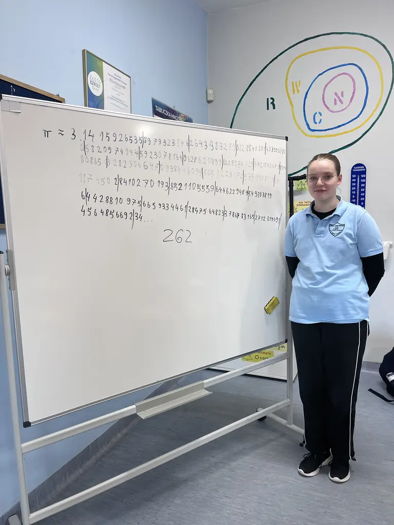 Zadanie polegało na zapamiętaniu jak największej liczby cyfr po przecinku w rozwinięciu liczby Pi. Bezapelacyjną mistrzynią została Małgorzata Szołtysik, która ustanowiła nowy rekord naszej szkoły, zapamiętując aż 262 cyfry! Poprzedni rekord, należący do uczennicy z 2023 roku, wynosił 237 cyfr. Ogromne brawa za tę niesamowitą pamięć!